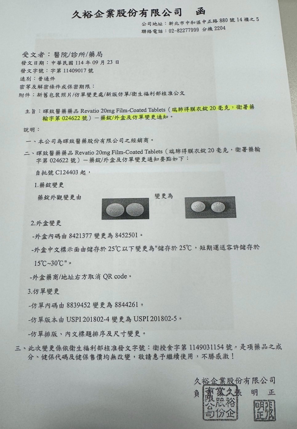 【包裝外觀變更公告】 瑞肺得膜衣錠20毫克 藥錠/外盒及仿單變更