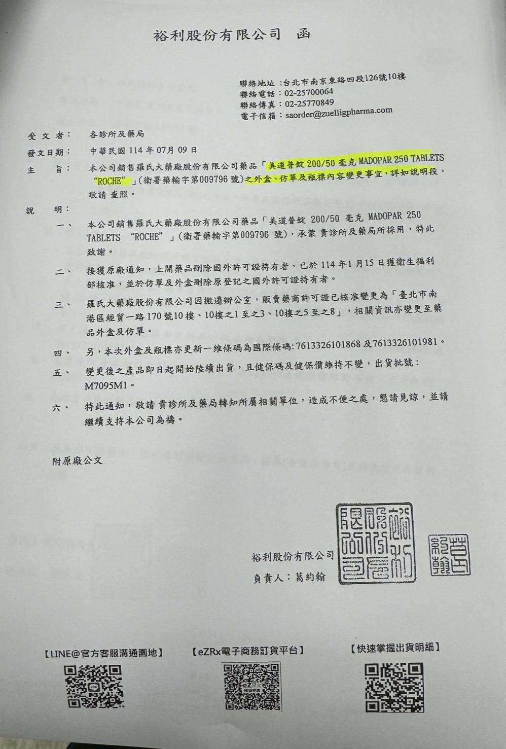 【包裝外觀變更公告】 “羅氏”美道普200/50毫克之外盒、仿單及瓶標內容變更