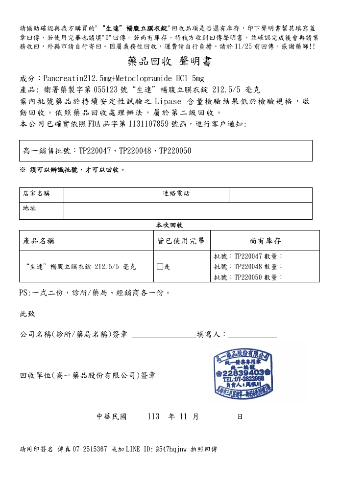 高一出貨之批號為:TP220047、TP220048、TP220050。
