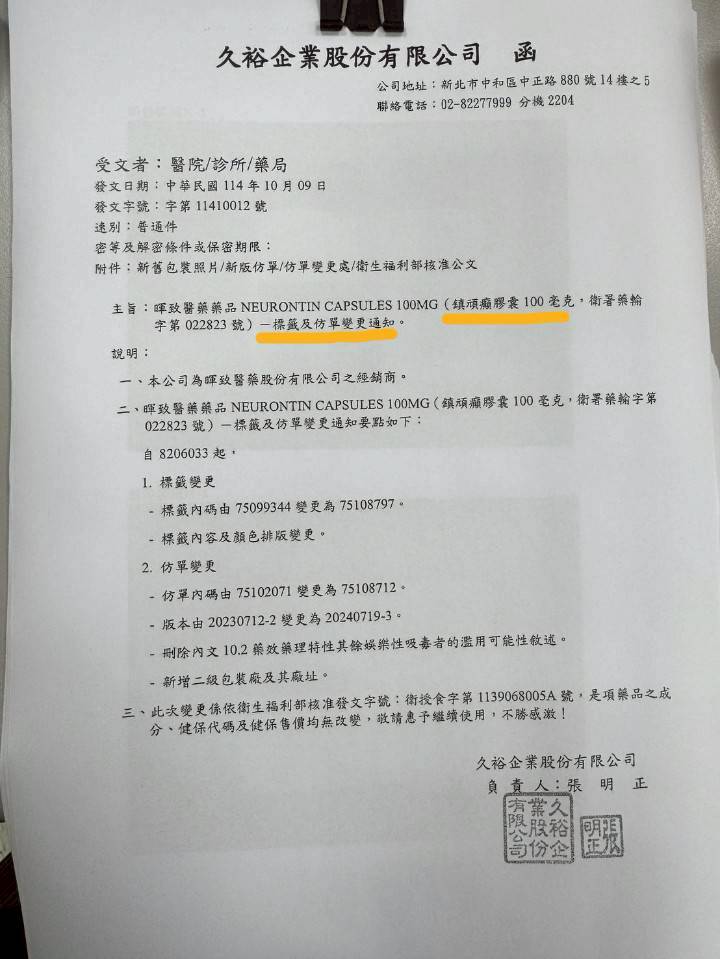 【包裝外觀變更公告】 鎮頑癲膠囊100毫克 標籤及仿單變更
