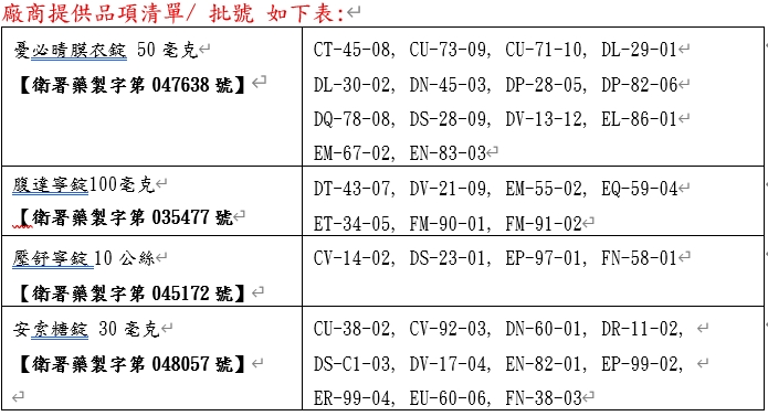 因羅得化學製藥股份有限公司配合食藥署例行GMP查核改善作業,下列品項部分批號未能符合規格, 為配合後續稽查改善作業,經廠內評估啟動自主回收效期內相關批號。 請參考各品項回收相關批號。因批號繁多,請善加使用LINE@ 【ID @547hqjnw】或EMAIL: abc2515368@gmail.com聯繫敝公司,確認為敝公司出貨之批號。