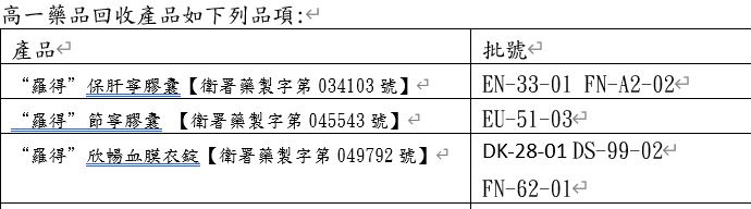 因羅得化學製藥股份有限公司配合食藥署例行GMP查核改善作業,下列品項部分批號未能符合規格, 為配合後續稽查改善作業,經廠內評估啟動自主回收效期內相關批號。 請參考各品項回收相關批號。因批號繁多,請善加使用LINE@ 【ID @547hqjnw】或EMAIL: abc2515368@gmail.com聯繫敝公司,確認為敝公司出貨之批號。
